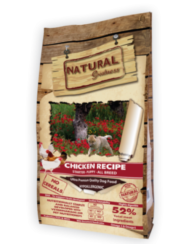 Natural Greatness pienso sin cereales elaborado con carne fresca ultra premium, lo que lo convierte en una fuente de proteína de alta calidad para tu perro. Tiene un sabor irresistible y contiene altos niveles de proteína de calidad que influyen positivamente en el sistema inmunitario del perro. Además, incluye pro y prebióticos para mejorar la digestión y la salud intestinal de tu mascota. Natural Greatness está diseñado para ofrecer una nutrición completa y balanceada para tu mascota, hecho sin cereales ni aditivos artificiales.