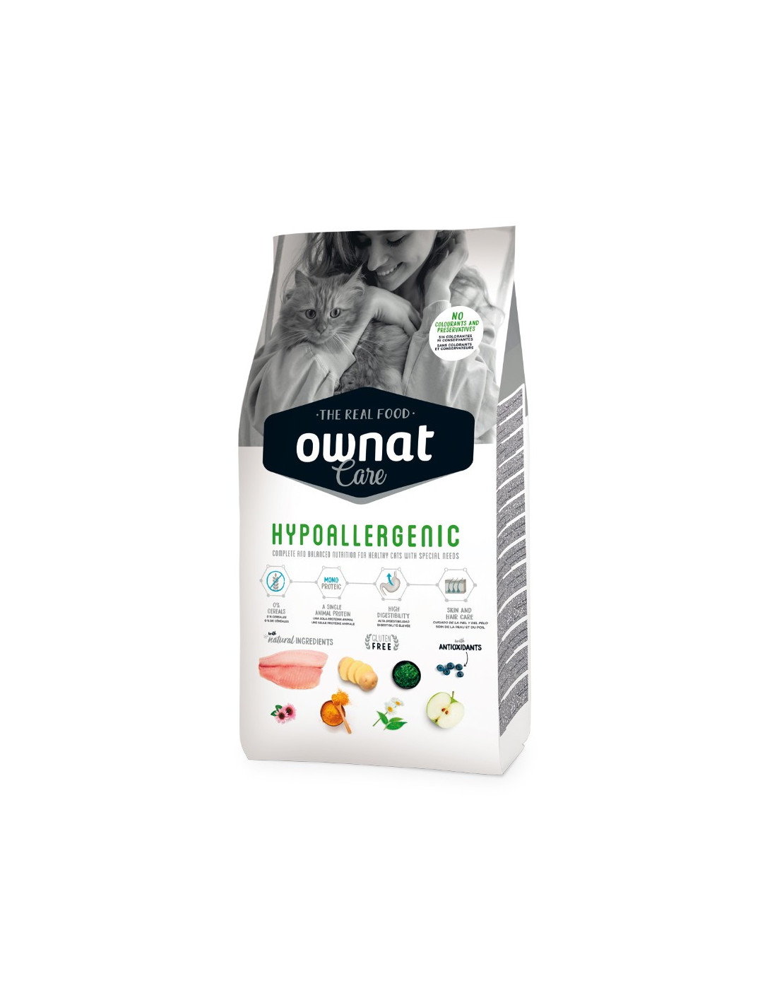 Ownat Care Hypoallergenic para gatos está hecho con pescado hidrolizado como única fuente de proteína y sin cereales, lo que lo hace ideal para gatos con alergias o sensibilidades alimentarias. Además cuenta con altos niveles de omega-3, esenciales para mantener la salud del corazón, la piel y el pelaje de tu gato. Con Ownat Care, puedes estar seguro de que estás proporcionando a tu gato una nutrición completa y equilibrada.