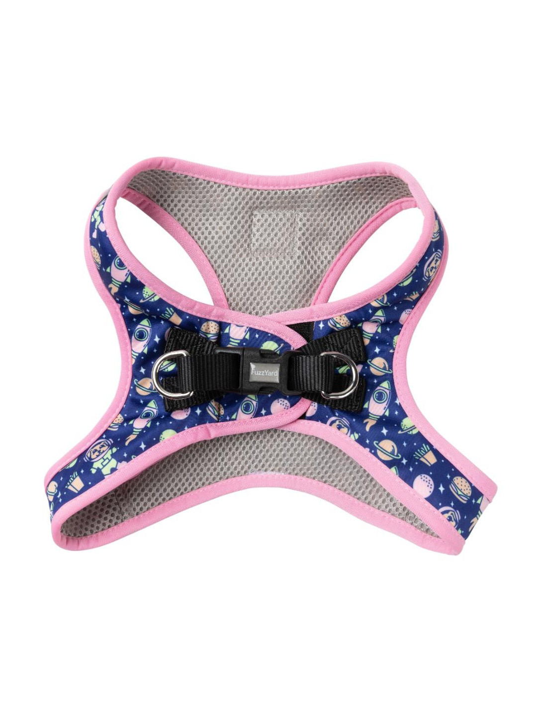Los arneses Step In de FuzzYard son los más flexibles del mercado, fabricados con telas suaves que se adaptan perfectamente al cuerpo de tu perro o gato, proporcionando total libertad de movimiento. Gracias a la suavidad y moldeabilidad de sus telas, estos arneses no provocan rozaduras ni cortan el pelo. Diseñados para colocarse por las patas, estos arneses se ajustan fácilmente con tiras de velcro y un cierre clic. El arnés step in de FuzzYard, comparado con los arneses regulares, tiene menos centímetros para adaptarse, siendo ideal para perros con una fisonomía recta, ya que su contorno del cuello y pecho es muy similar. La parte externa está hecha con hilos finos que permiten una definición precisa del exclusivo estampado de FuzzYard. Cada lado del arnés tiene una tira reflectante que brilla con la luz, y la parte interna cuenta con doble rejilla transpirable para una excelente ventilación en los días más calurosos, además de secarse rápidamente. Todas las uniones de las telas están cuidadosamente cosidas para ofrecer acabados de calidad superior y un diseño estéticamente atractivo. Las anillas de acero inoxidable, sin soldaduras, evitan la oxidación y protegen el pelo de tu mascota y el arnés. El logotipo es de goma elástica, añadiendo un toque distintivo.