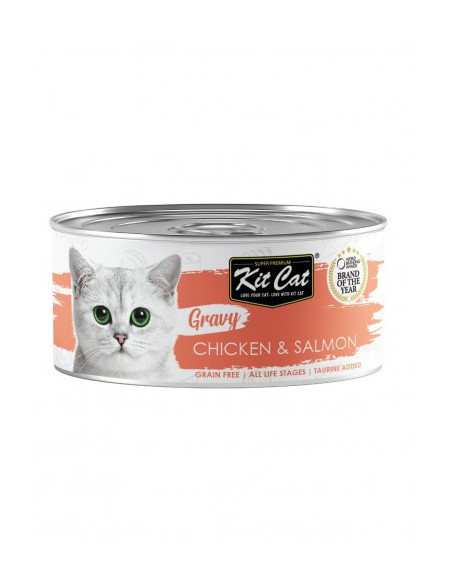 Lata de comida húmeda para gatos libre de cereales, gluten y subproductos. Nuestra receta está hecha con ingredientes de la más alta calidad y nutrientes esenciales para asegurar una dieta óptima y saludable para tu gato. En Kit Cat, nos destacamos por incluir prebióticos en nuestras recetas, promoviendo una flora intestinal saludable y fortaleciendo el sistema inmunitario de los felinos. Además, añadimos nutrientes esenciales como Vitamina E, Omega 3 y 6, y Taurina, proporcionando un extra de bienestar para tu gato.