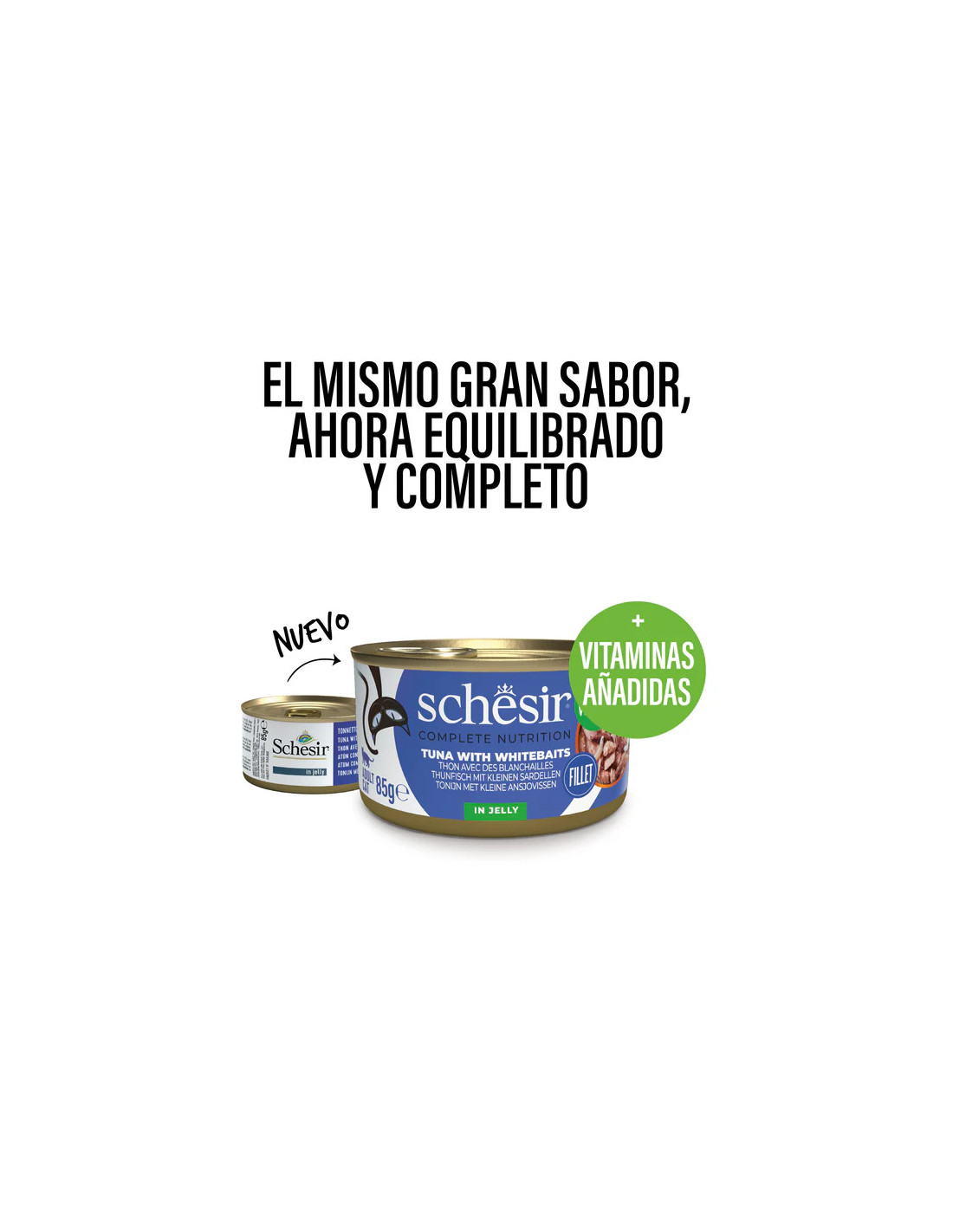 Schesir Atún con Anchovetas en Gelatina es una comida húmeda natural para gatos adultos, alta en proteínas, baja en grasas y con textura suave que favorece la hidratación.