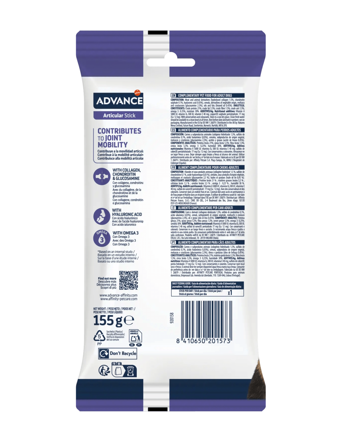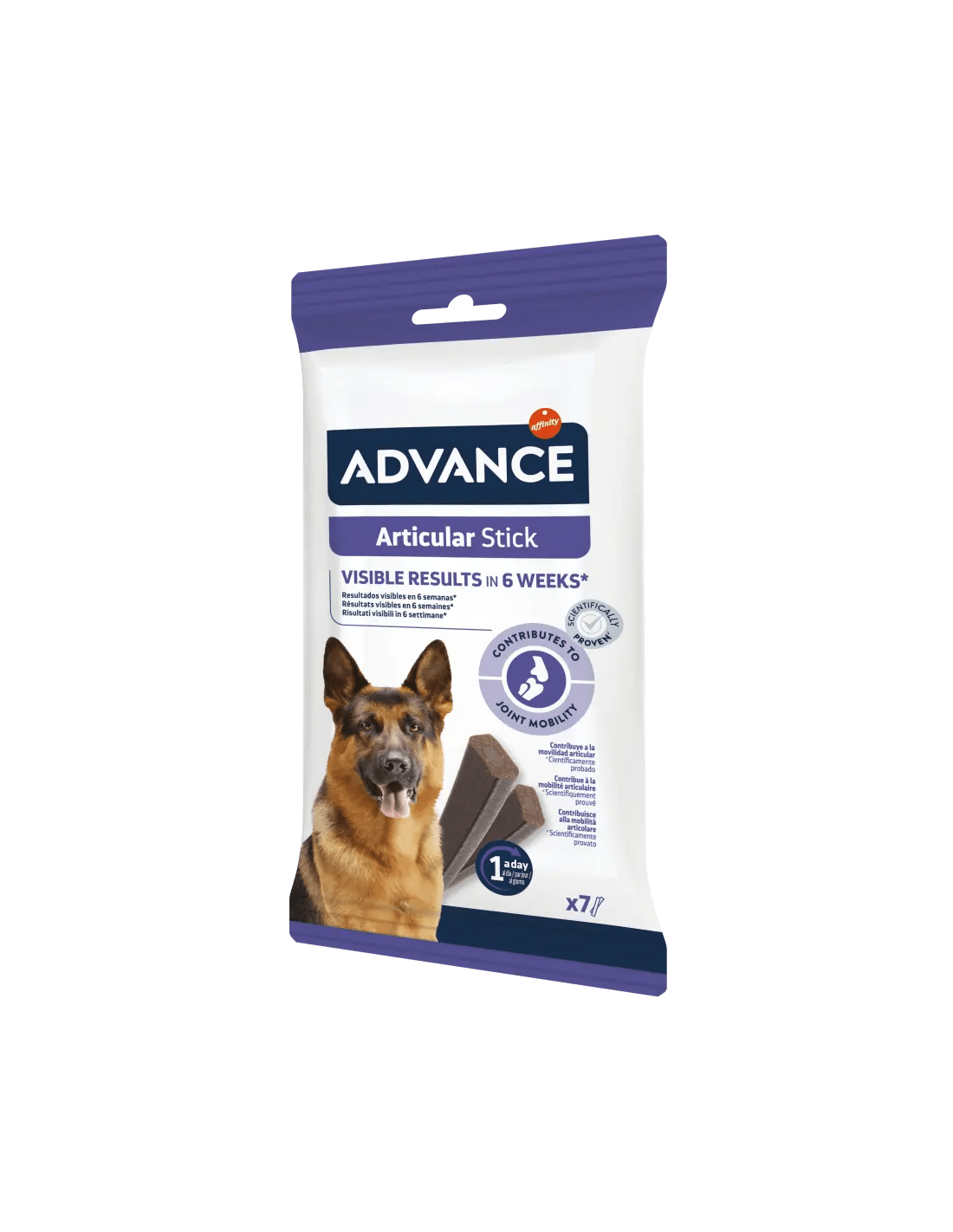 Advance Articular Stick es el snack funcional ideal para mejorar la movilidad articular de tu perro, con resultados visibles en solo 6 semanas. Su exclusiva fórmula combina ácido hialurónico y Omega-3 para mantener las articulaciones bien lubricadas y favorecer su flexibilidad. Además, contiene colágeno, condroitina y glucosamina, ingredientes clave para estimular el metabolismo del cartílago y ralentizar su desgaste, ayudando a mantener unas articulaciones saludables por más tiempo.