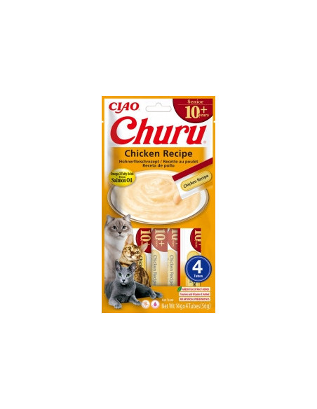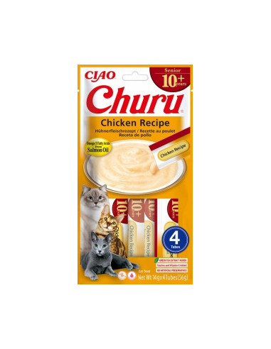 CHURU RECETA SENIOR POLLO es un snack cremoso premium diseñado especialmente para gatos mayores de 10 años, con una textura suave y apetecible que facilita su consumo incluso en felinos con dientes sensibles o menor capacidad de masticación.